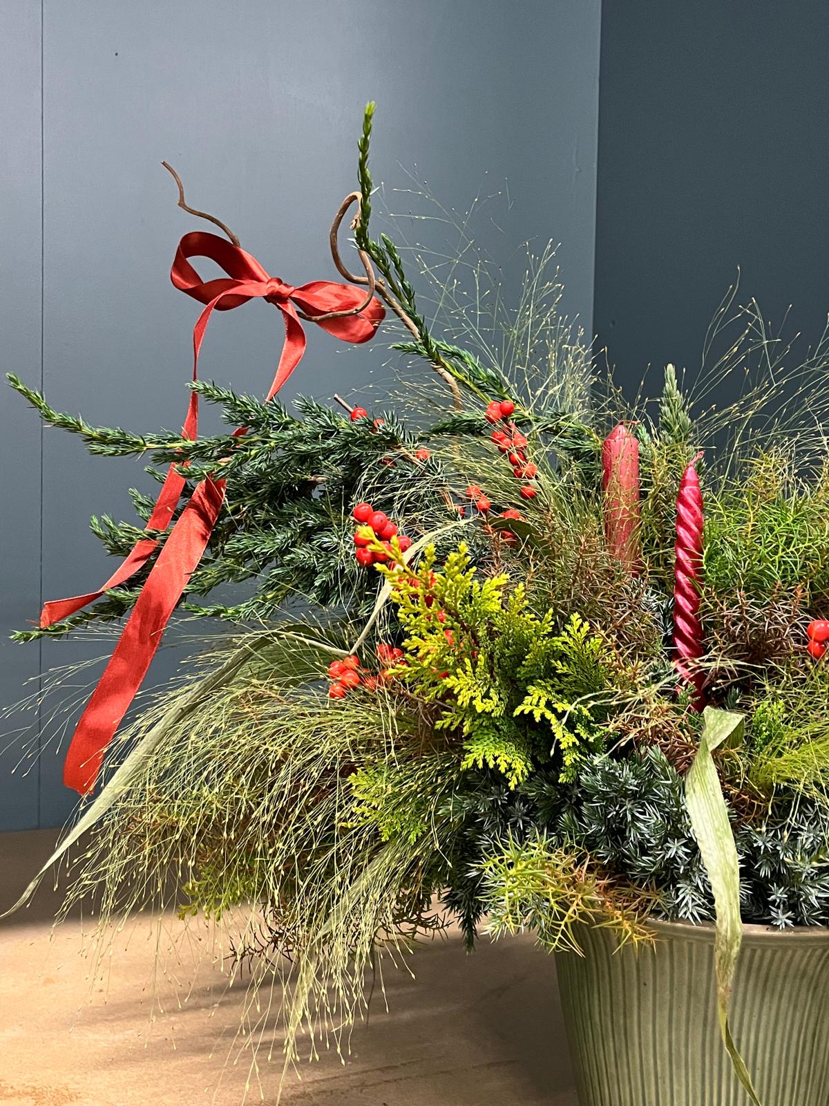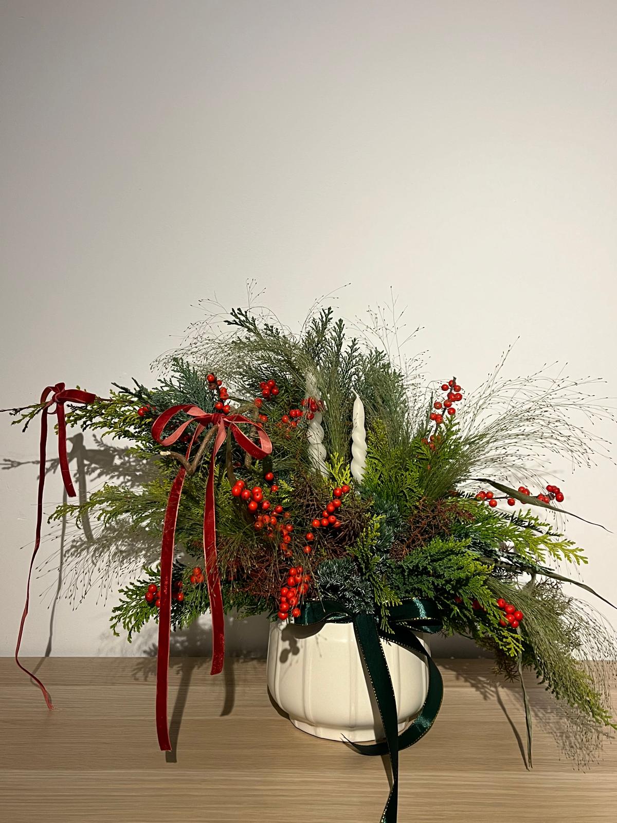 Un montage alliant du sapin, des végétaux de saison et des bougies délicates, qui diffusera une atmosphère chaleureuse et poétique à votre intérieur, et qui durera tout le mois de décembre - un éclat de fôret au sein de votre "chez vous".